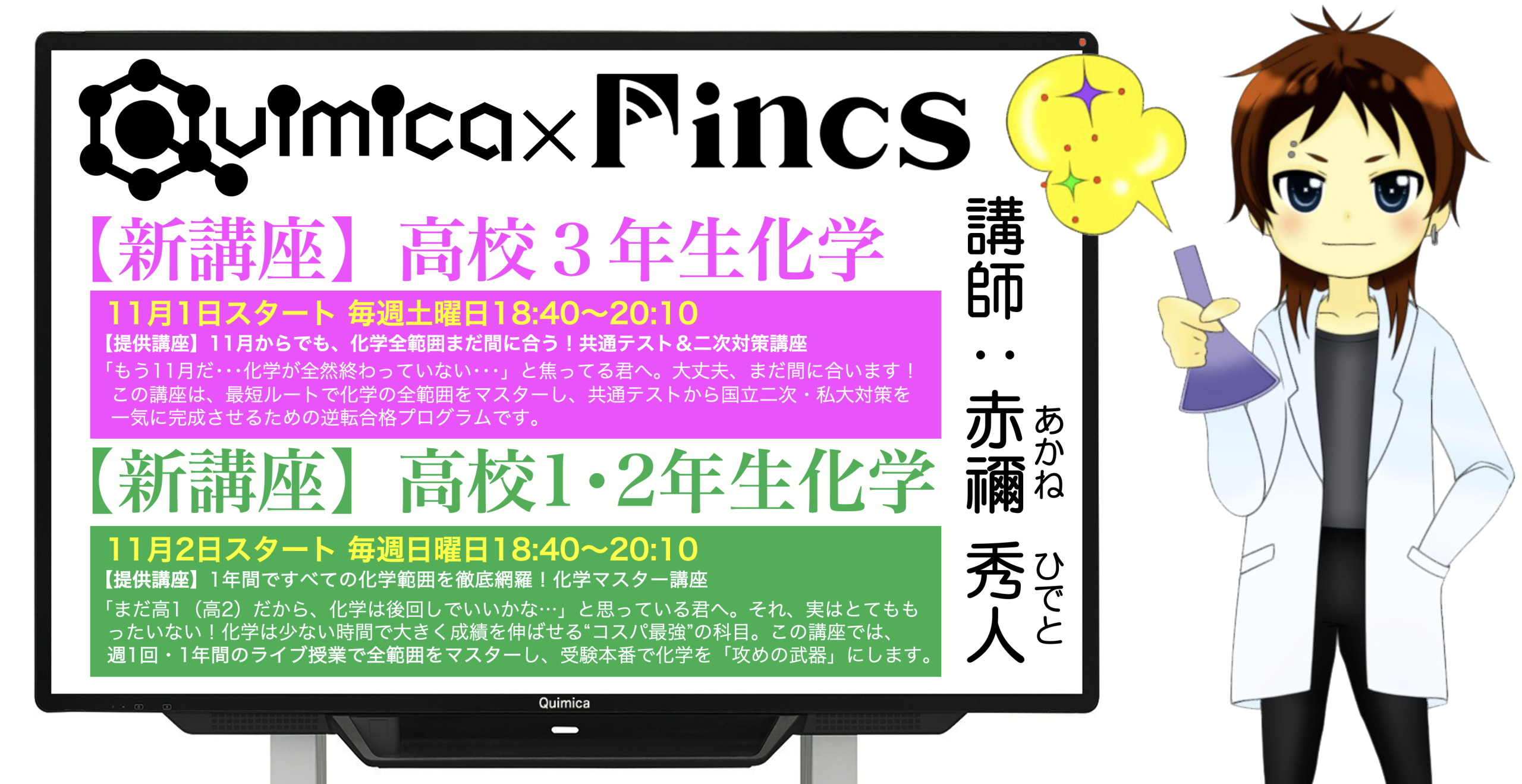 Quimicaでは、無料で化学を学習できるコンテンツをお届けするため、公式X(旧Twitter)を運営しています。 講師のX(旧Twitter)では、要点まとめ・語呂合わせ・確認問題・化学豆知識など、学習に役立つ情報を随時発信中です。 また、季節講習や各種イベントの最新情報は Quimica公式X(旧Twitter)にてご案内しています。 ぜひフォローして、日々の学習や受験対策にご活用ください!