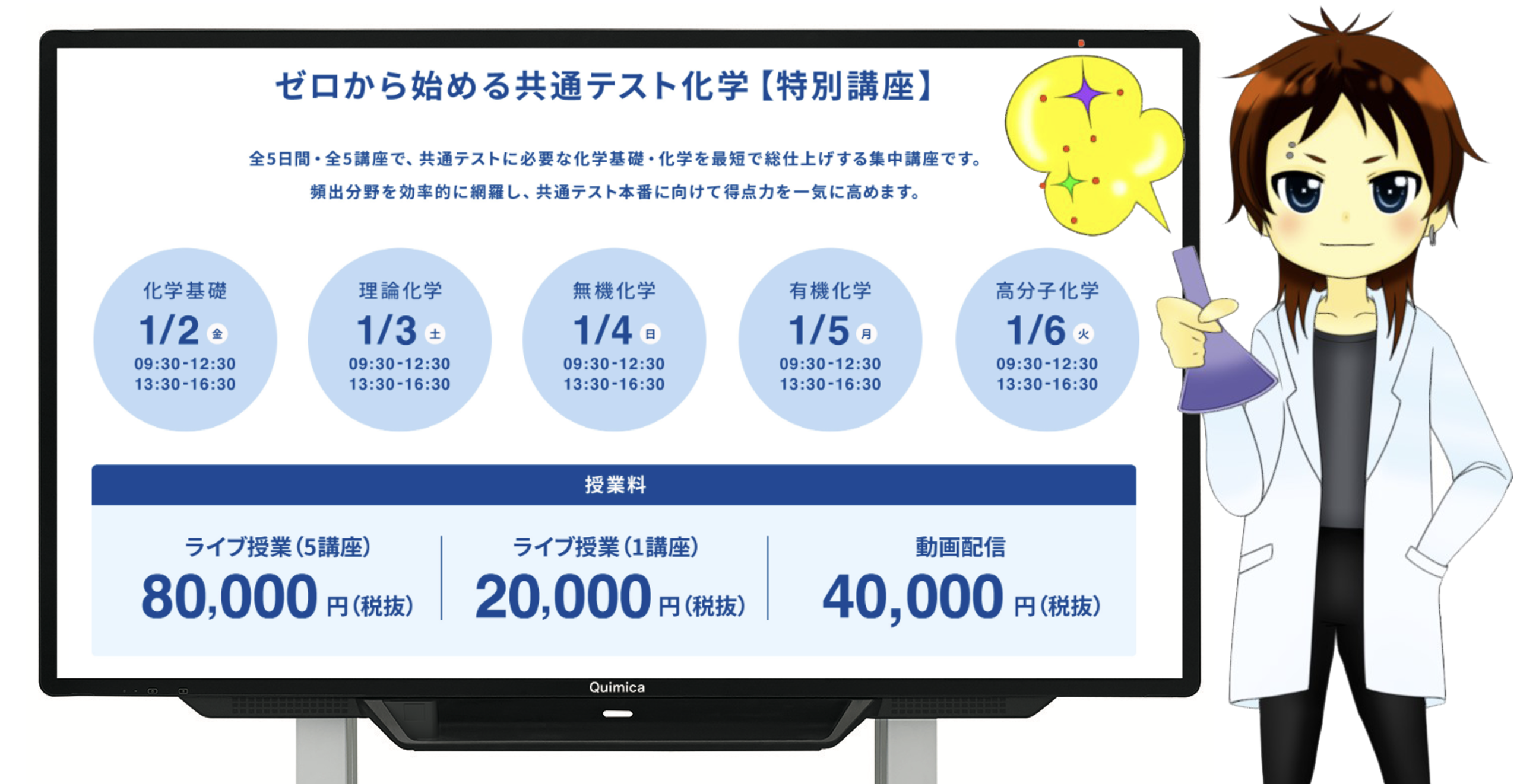 Quimica(ケミカ)は、コロナ禍以前から10年以上にわたりオンライン授業に特化してきた、化学専門の予備校・塾です。 一般的な「映像受講型」や「通信教育型」のような一方通行の授業ではなく、双方向でのやり取りを通じて化学を深く学べるライブ授業を行っています。 自宅にいながらも、まるで教室で授業を受けているかのような臨場感を体験できるのが特徴です。 また、授業後にはテキストと一緒に YouTube 上で化学の授業動画を配信しており、何度でも視聴して復習に活用できます。 本格的に化学を学びたい方、医学部受験や難関大を目指す方に最適な 化学専門予備校・オンライン塾です。